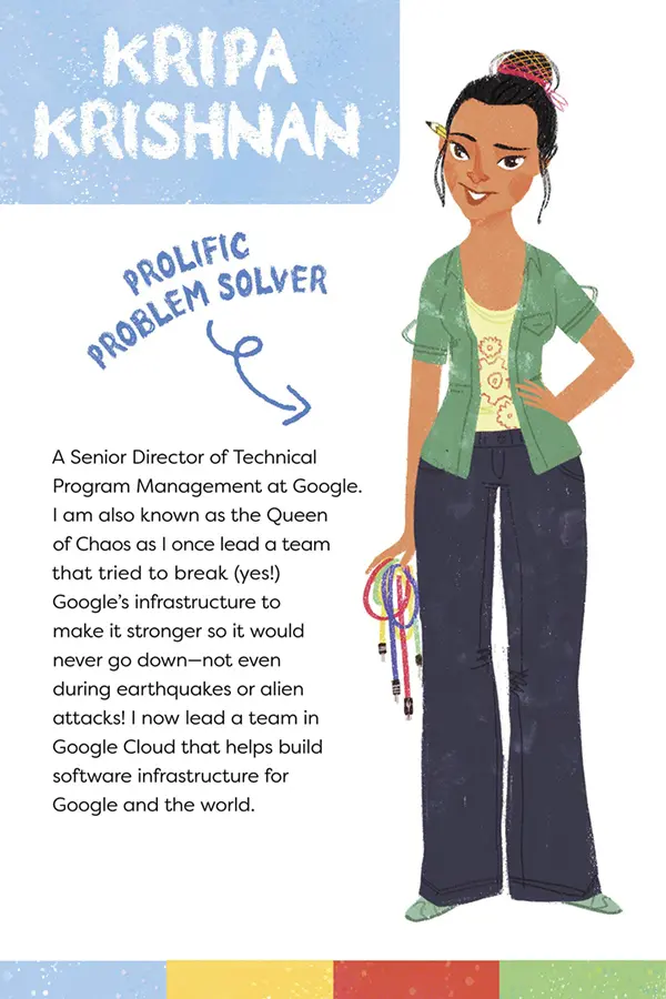 In the book, Krishnan, whose fictional title is “Prolific Problem Solver,” helps Ara and her robot friend figure out whether they can count all the stars in the sky. They can’t, but that’s part of the lesson. “She fails—and someone teaches her to pick herself up and try again. That’s so important,” Krishnan says.