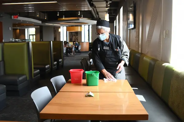 When students are finished eating, they remove a card from the table which indicates that it needs to be sanitized by a University Dining staff member.