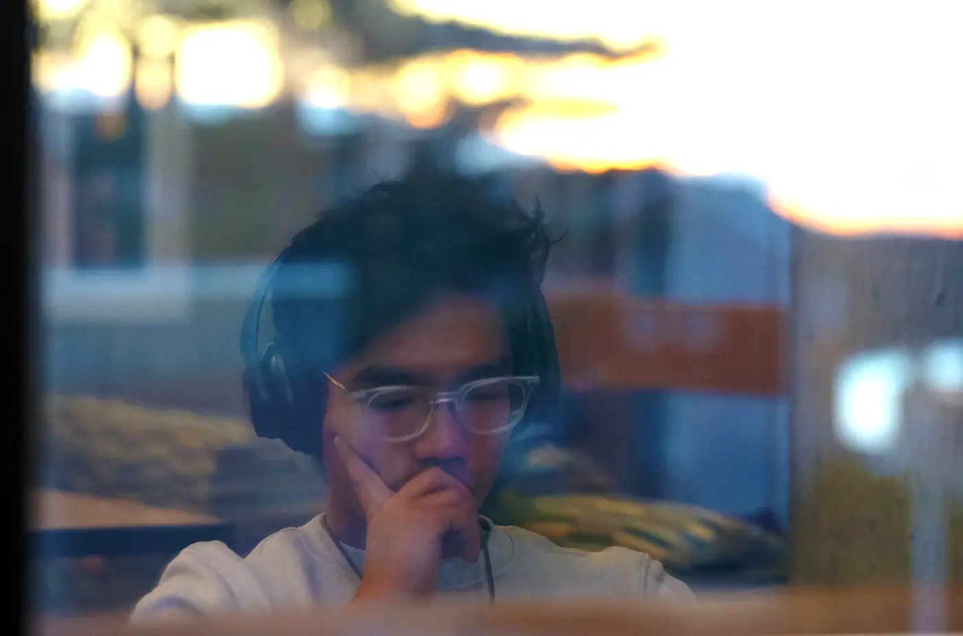 South Campus is reflected in a window as a student listens to music while studying at O'Leary Library.
