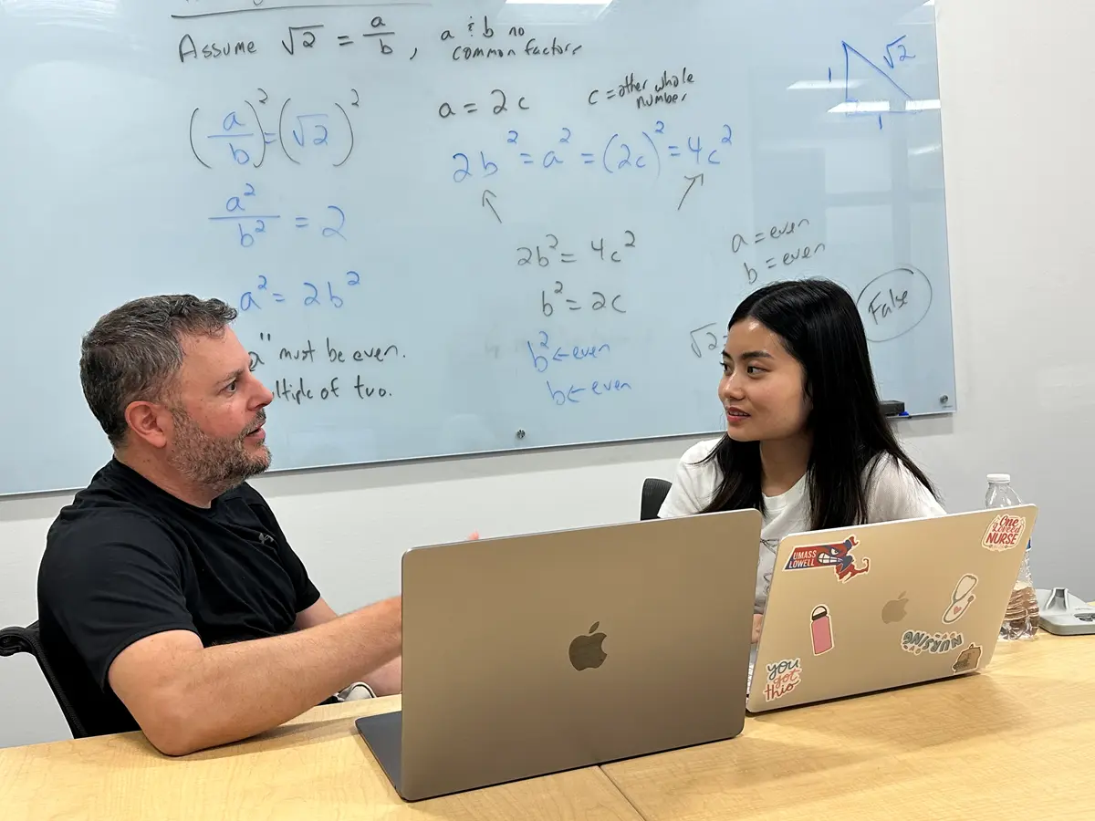 Beyranevand and nursing major Kelly Duong discuss a story about the discovery of irrational numbers.