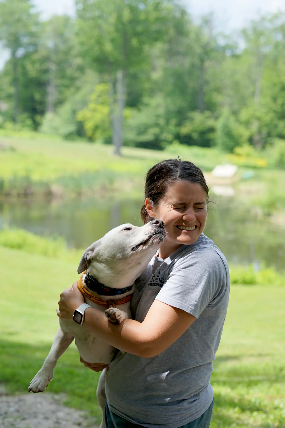 "I love helping dogs grow into a better version of themselves," says Kristin Morrissey Jordan '14, seen here with "super mix" Alfredo on the Second Chance Ranch Rescue property.