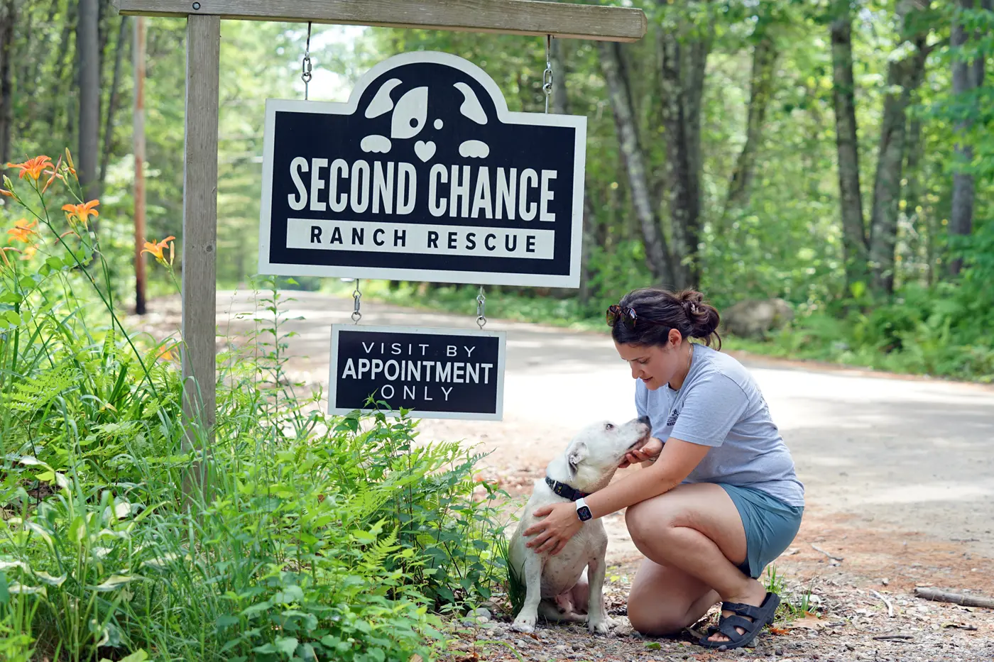 A friendly white “super mix” dog named Alfredo runs out to greet you when you pull into the driveway of Second Chance Ranch Rescue in rural New Boston, New Hampshire.