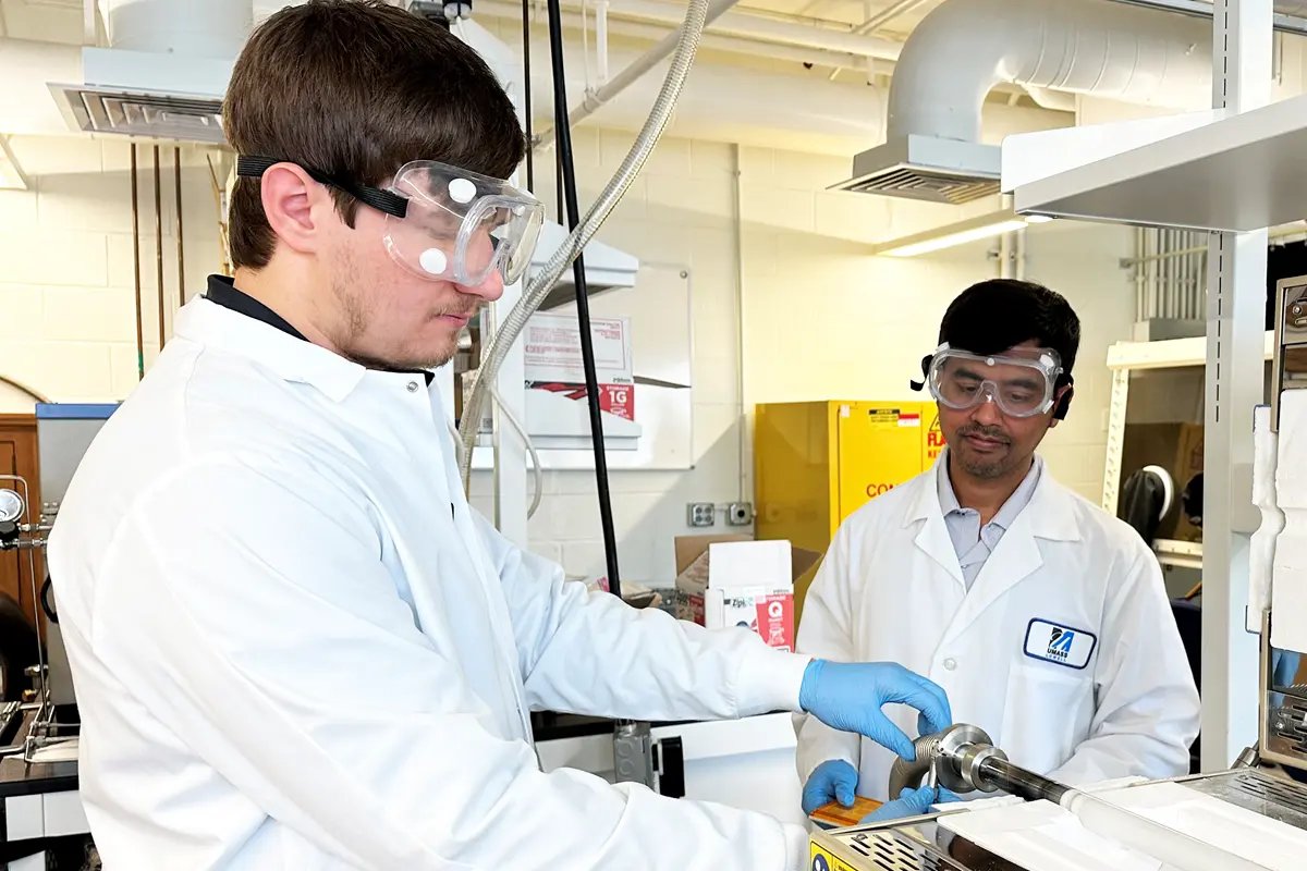 Asst. Prof. Anhar Bhuiyan watches as Ph.D. student Ahmed Ibreljic adjusts a machine making gallium oxide film.