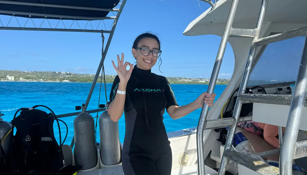 In the lab, DeSouza processed coral samples to be analyzed for stony coral tissue loss disease. She also traveled to the Colombian island of San Andrés during her senior year to help with field research. While there, she got her diving certification, which was fully funded by a Women Divers Hall of Fame grant.