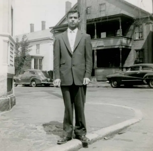 In the wake of national legislation restricting immigration to the United States, there were few Portuguese born overseas who settled in Lowell, between 1924 and the late 1950s. Among the small number of Portuguese families from the Azores who came to Lowell during this period of limited immigration was the Braga family. Daniel Braga, son of Francisco and Herminia Braga, is seen here on the corner of Charles and Lawrence streets. Behind him is the tenement in which the Braga family lived for a number of years.